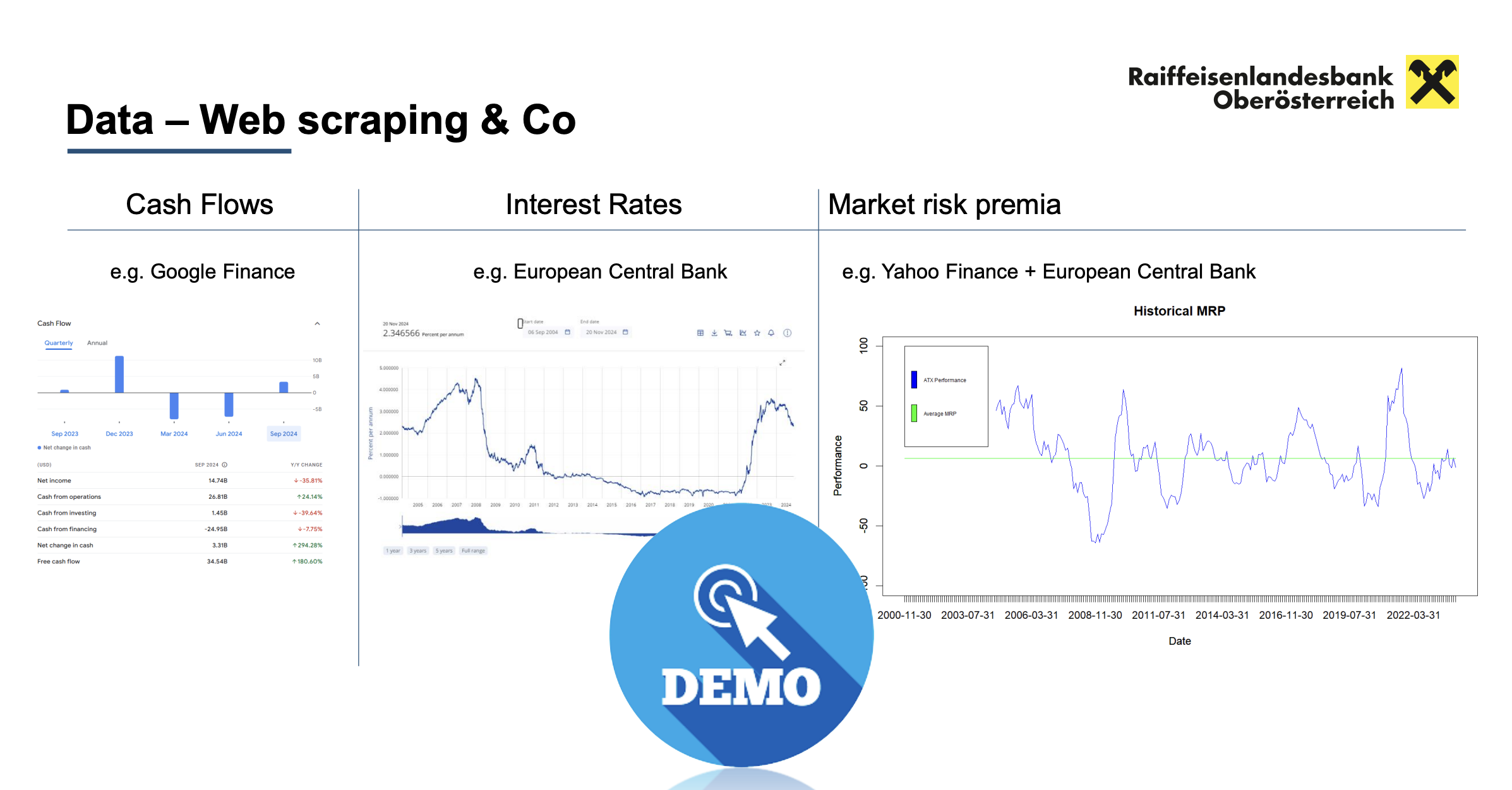 Using the ecb R package, participants saw how to fetch interest rate curves directly from the European Central Bank. Then, leveraging web scraping with packages like rvest, stringr, and xml2, Aigner demonstrated how to extract key financial statements—such as cash flow data—from sources like Google Finance and Yahoo Finance.