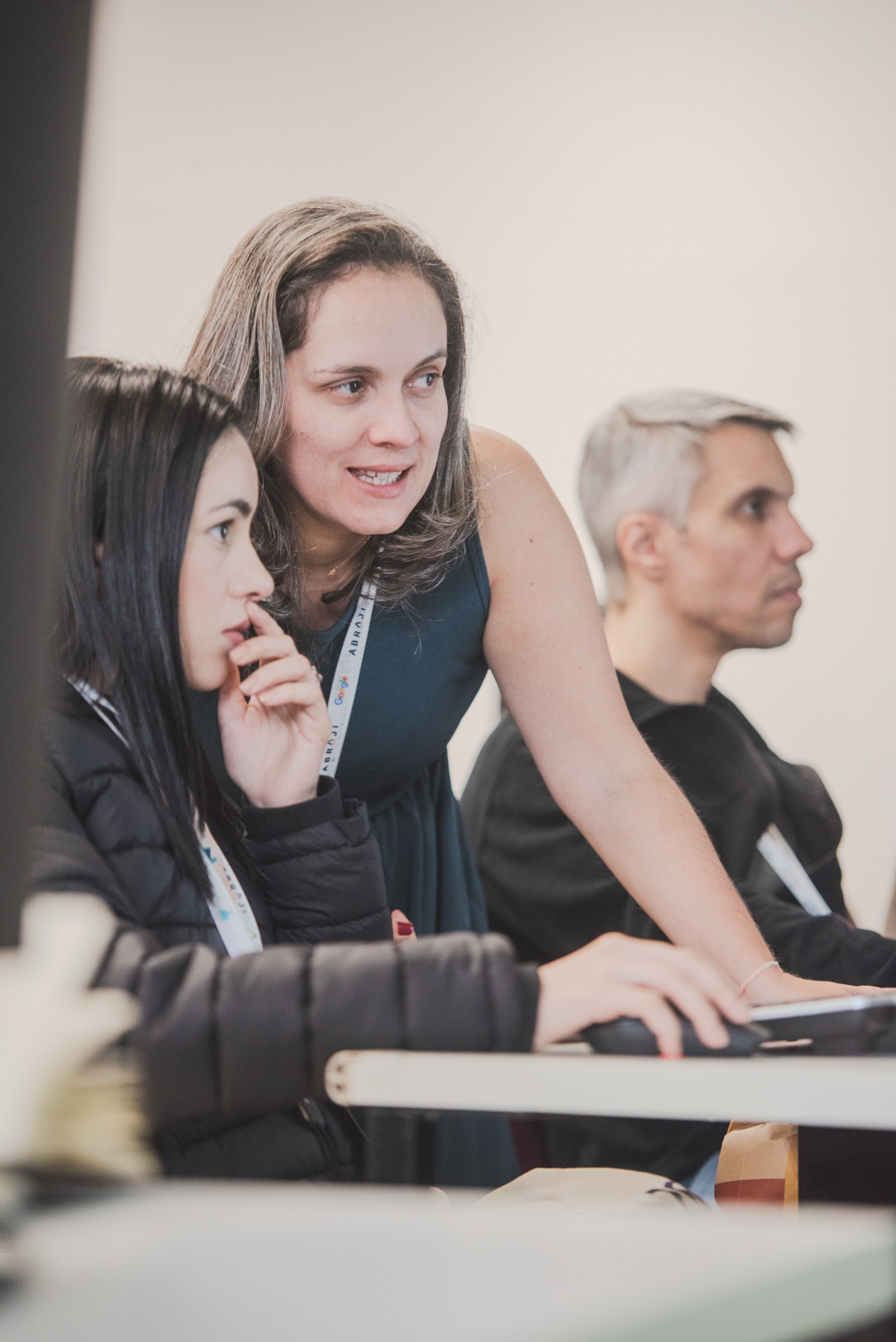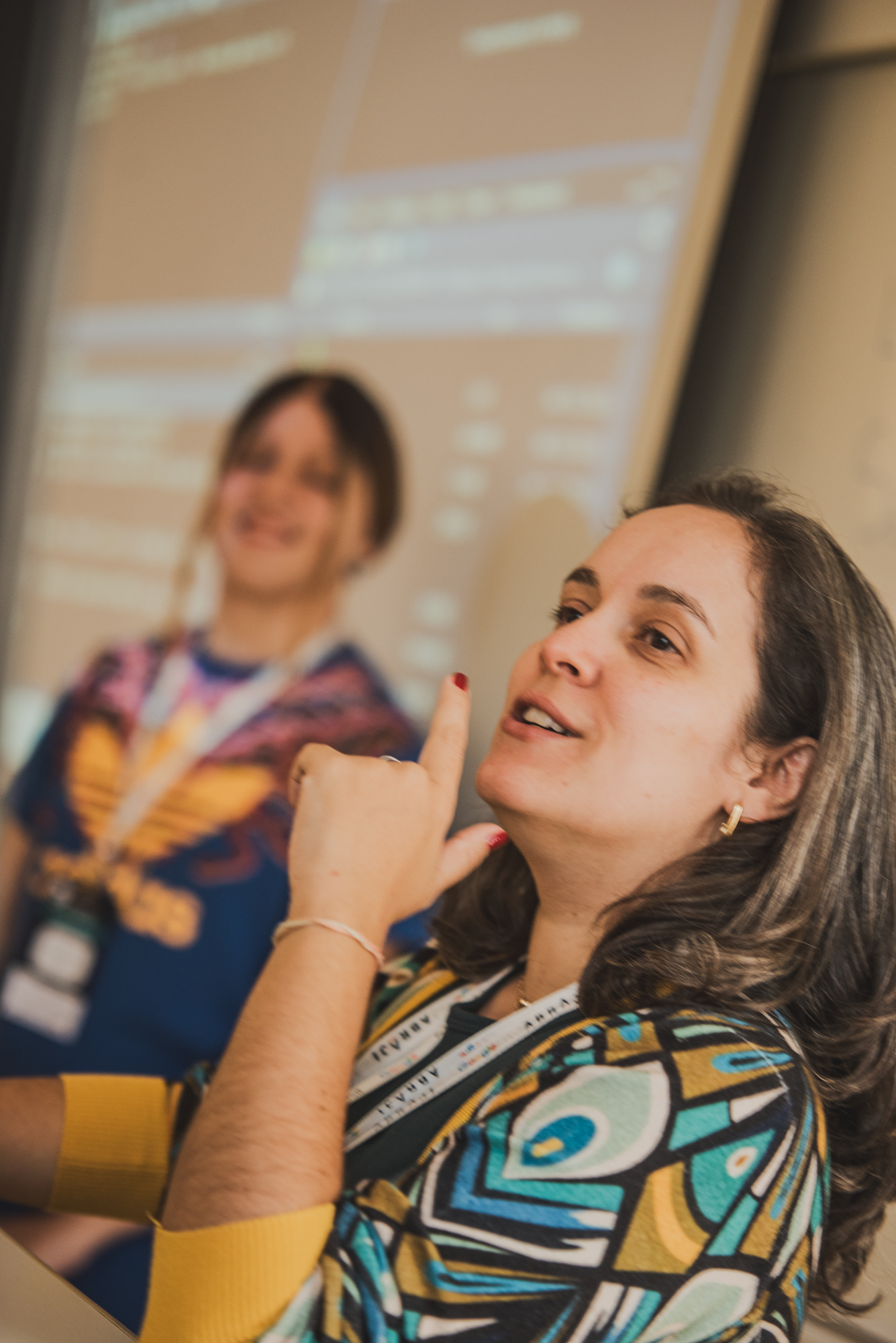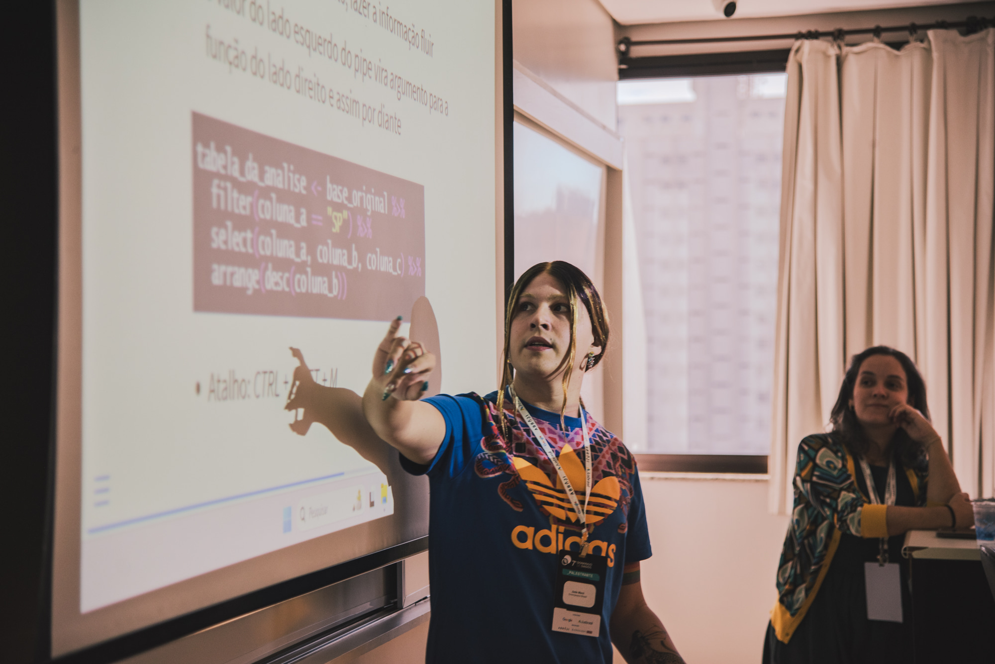 Pictures from the R track during the Abraji congress. Jade Maré, co-organizer at R-Ladies São Paulo and a Carpentries certified instructor (woman in blue). Rafael Pereira, head of Data at Ipea, the Brazilian Institute for Applied Economic Research, a federal government institution (man in glasses). He’s the creator of packages geobr, censobr, geocodebr, flightsbr and many more, and Carol Moreno, Abraji Director (woman in peacock sweater).